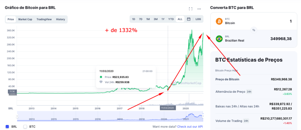 Se você tivesse investido os mesmos 1000 reais no dia 11/03/2020, você teria incríveis R$ 13.326. De novo, sem fazer absoutamente nada.